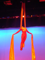 巴西組合表演節(jié)目(一):“綢吊”,它的表現(xiàn)形式,將表演道具“綢吊”在寬度和色彩上加以夸張,并將一般垂直“綢吊”的表演形式改革創(chuàng)新為快速飛旋的高空表演,在編排創(chuàng)意上以人類永恒的“情愛”立意,表現(xiàn)了人類對美好愛情的向往追求。其充滿浪漫情懷的藝術(shù)表現(xiàn)就給現(xiàn)場觀眾帶來了強(qiáng)烈的震撼。