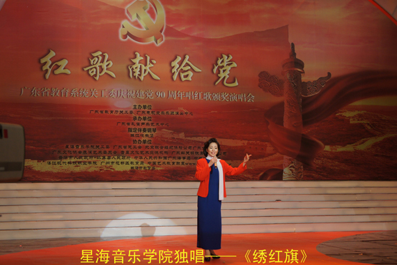 11年7月參加廣東省教育廳關(guān)工委“紅歌獻(xiàn)給黨”頒獎(jiǎng)典禮,主演江姐一角,獨(dú)唱《繡紅旗》