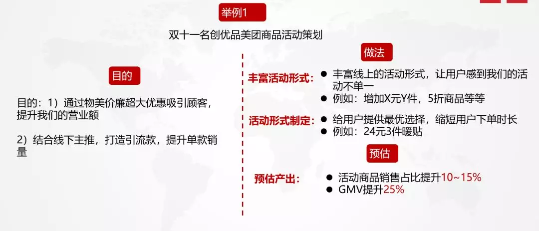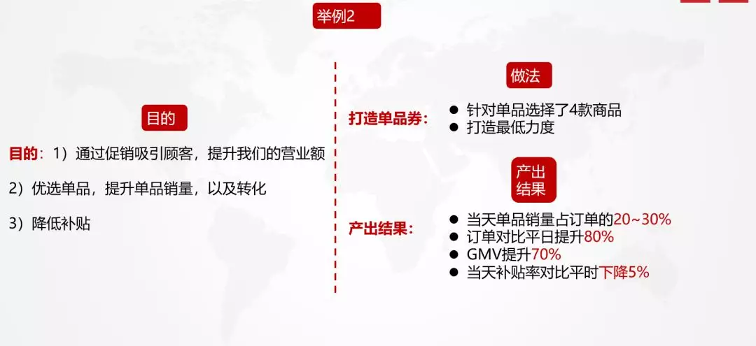 第二個(gè)例子是曾經(jīng)在某O2O平臺(tái)工作時(shí)的活動(dòng)策劃,其中活動(dòng)策劃目的對(duì)比舉例一增加了降低平臺(tái)補(bǔ)貼率,活動(dòng)形式上,除了常規(guī)的商品活動(dòng)以外,這次還額外增加了單品券的活動(dòng)形式。