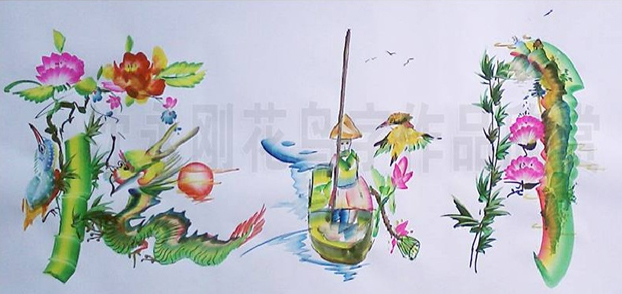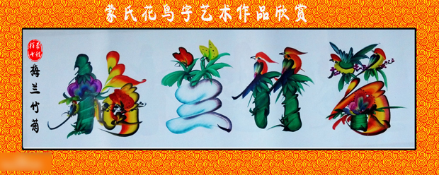 民間花鳥字,又叫龍鳳字、多彩花鳥蟲魚組合書法、藏字畫、字謎語(yǔ)、飛帛板書、意匠文字,又因?yàn)槌3S糜跁鴮懩硞€(gè)人的姓名,故也有叫做名字作畫,等等。它利用特制的多彩畫筆,一氣呵成,能快速繪出簡(jiǎn)潔的物形、螺線等代替文字的筆畫,利用字里藏畫的結(jié)構(gòu)形式,巧妙地融字、畫于一體,表達(dá)出吉祥喜慶等多種效果,同時(shí)又增強(qiáng)文字的意趣及視覺(jué)的吸引力。既有傳統(tǒng)國(guó)畫的干凈利落,又有西洋畫的鮮艷色彩。飛龍、舞鳳、花草、小鳥、蝴蝶、魚兒相映成趣,令人百看不厭,有書法家難起筆,畫家難潤(rùn)色之說(shuō),是中華民族歷史文化百花園中的一枝奇葩。