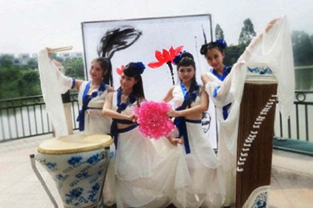 水墨畫被視為中國傳統(tǒng)繪畫,也就是國畫的代表。它是中國文化藝術(shù)的瑰寶,充分表現(xiàn)了古代文人的 文化內(nèi)涵。青花瓷樂器既有傳統(tǒng)的中國文化底蘊(yùn),又體現(xiàn)了新時 代的創(chuàng)新精神,凝聚了中國千年陶瓷文化的藝術(shù)精髓。在“墨香鼓韻”中,我們以水墨畫的形式現(xiàn)場給大家展示中國傳統(tǒng)文化的內(nèi)涵;其中又融入了青花瓷的元素, 有青花瓷鼓,青花瓷古箏編鐘器;用激 情和柔情相結(jié)合的配樂,再加上水袖荷花的優(yōu)美舞蹈。墨香,鼓韻,夾雜著淡淡的荷花香味;花美,舞媚,這一切匯聚成一幅美麗的畫卷。