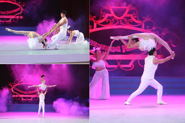 柔美肩上芭蕾演出的主色調(diào):飄逸、靈動、璀璨,技巧演出內(nèi)容:舞蹈在充分運(yùn)用雜技藝術(shù)的同時,大膽運(yùn)用芭蕾舞姿,讓美容天仙的公主插上翅膀,在王子的手臂和頭頂翩翩起舞,使古老的東方雜技和柔美的西方芭蕾融為一體。使表演更具亮點(diǎn)。通過高難度、精湛的舞蹈技巧體現(xiàn)專業(yè)與權(quán)威。